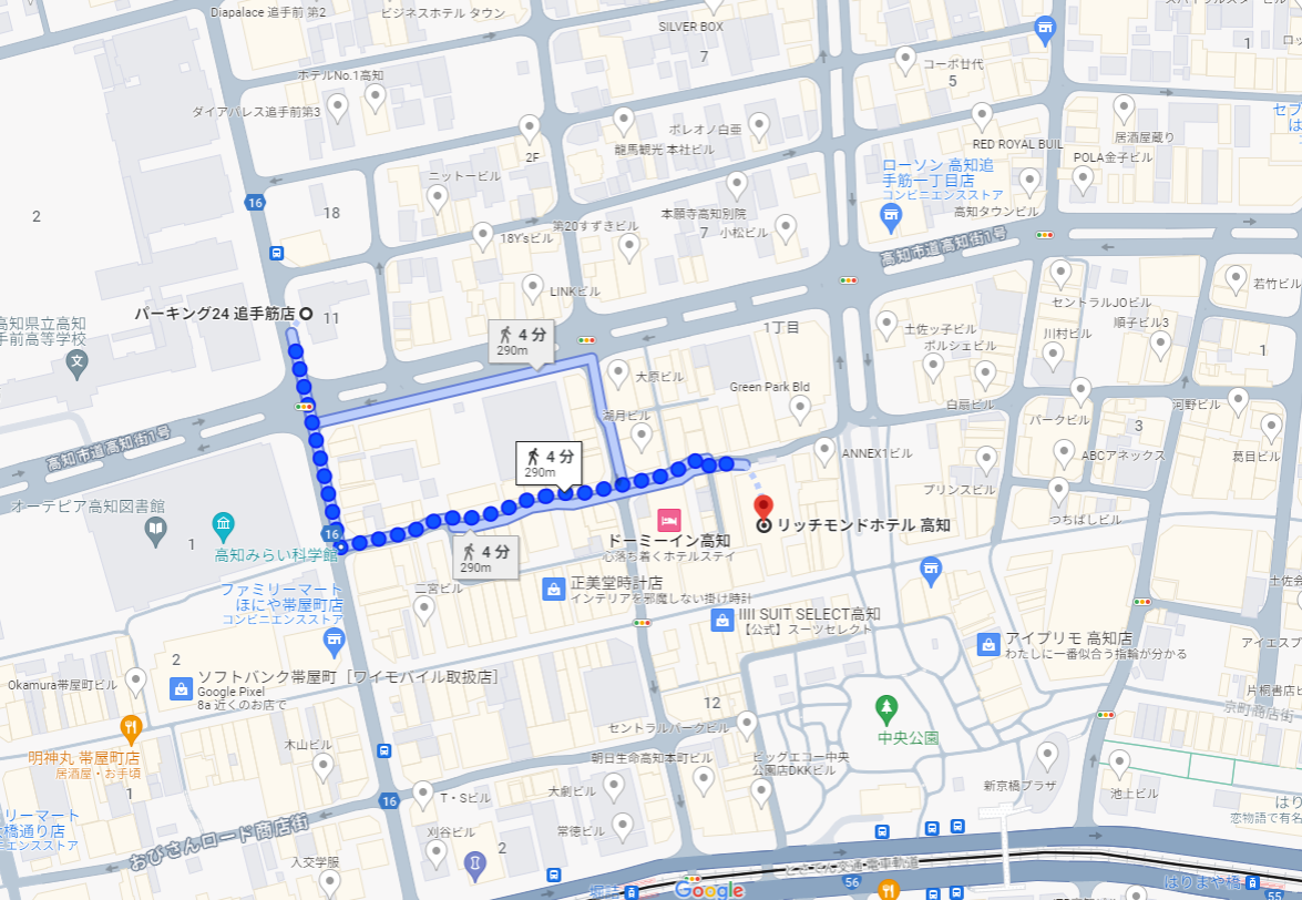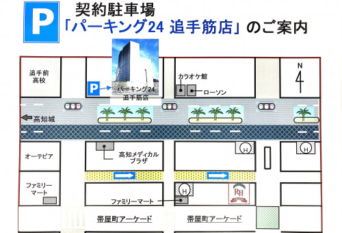 | 提携駐車場 | 【パーキング24 追手筋店】 TEL.088-875-8444 ※カーナビに駐車場の電話番号を入力して頂くと、駐車場までのアクセスに便利です。 ※機械式立体駐車場となっており高さ:205cmの制限がございます。 |