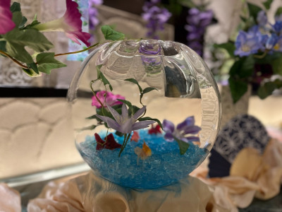 色鮮やかな夏の花々の中で揺れる風鈴、ロビーを包む爽やかなマンダリンの香り、五感で楽しめる癒しの空間となっております。暑さを忘れさせるような、心地よい空間でお客様をお迎えしています。