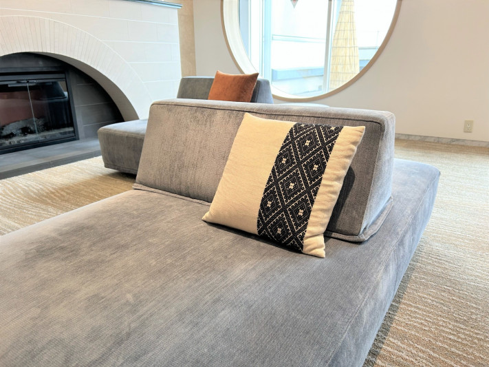 クッションにはこぎん刺しが刺繍されており、青森らしさを感じることもできます。