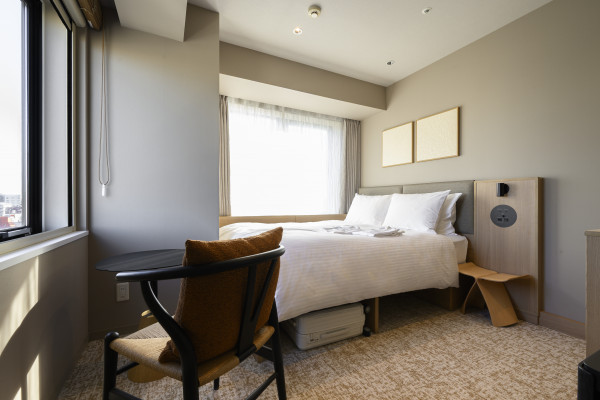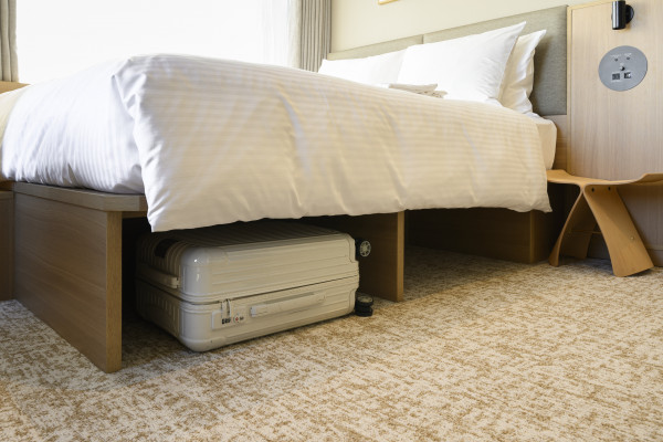 7階以上確約で、角部屋である8号室のお部屋です。窓からは浅草の景色をお楽しみいただけます。ベッド下にはキャリーケースが入れられるベッド下収納がございます。