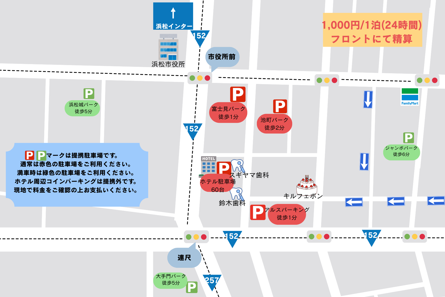 ホテル周辺駐車場のご案内でございます。1000円/1泊1台