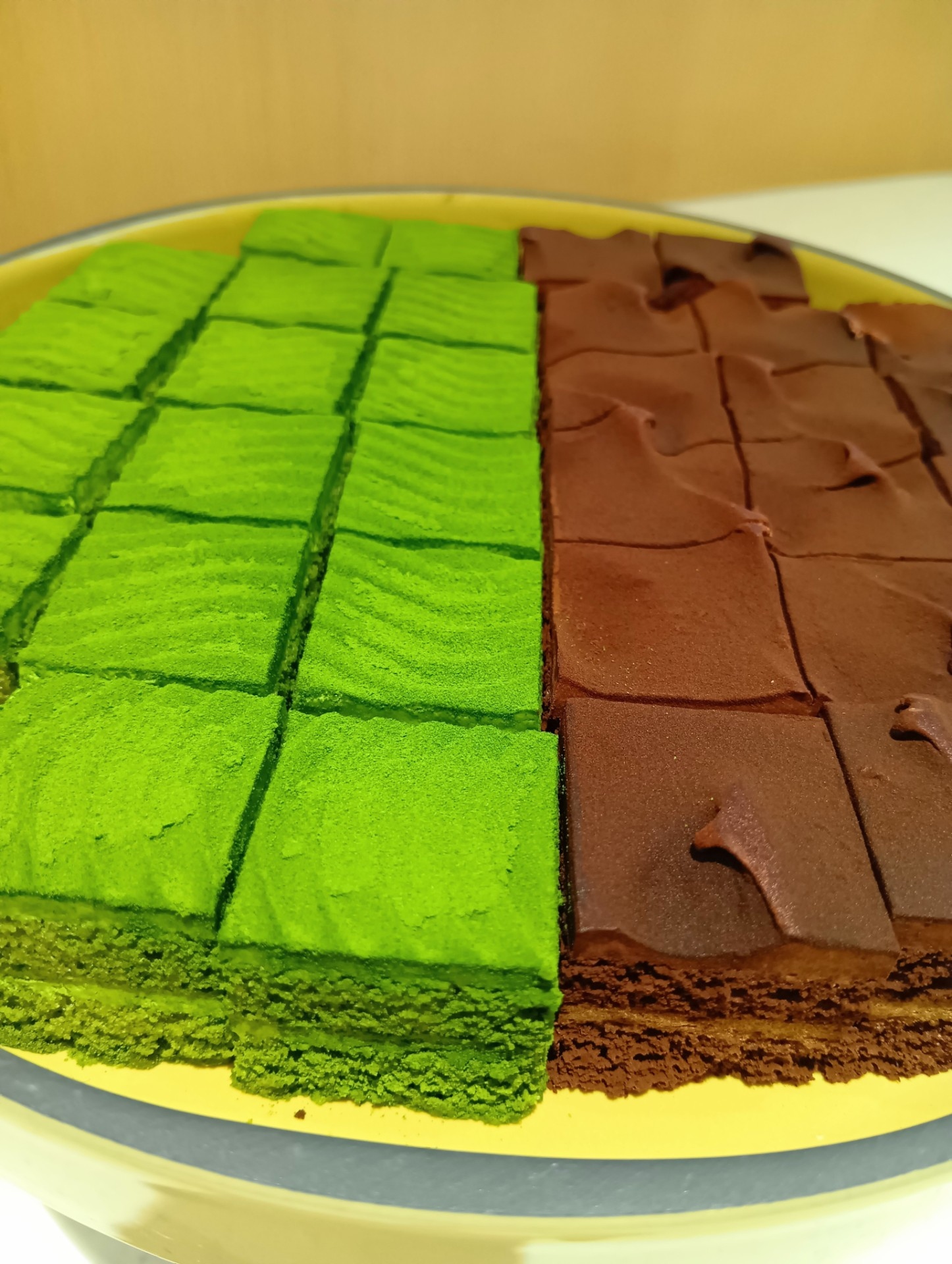 新鮮なフルーツ、ヨーグルト、抹茶・ビターチョコレートのケーキ