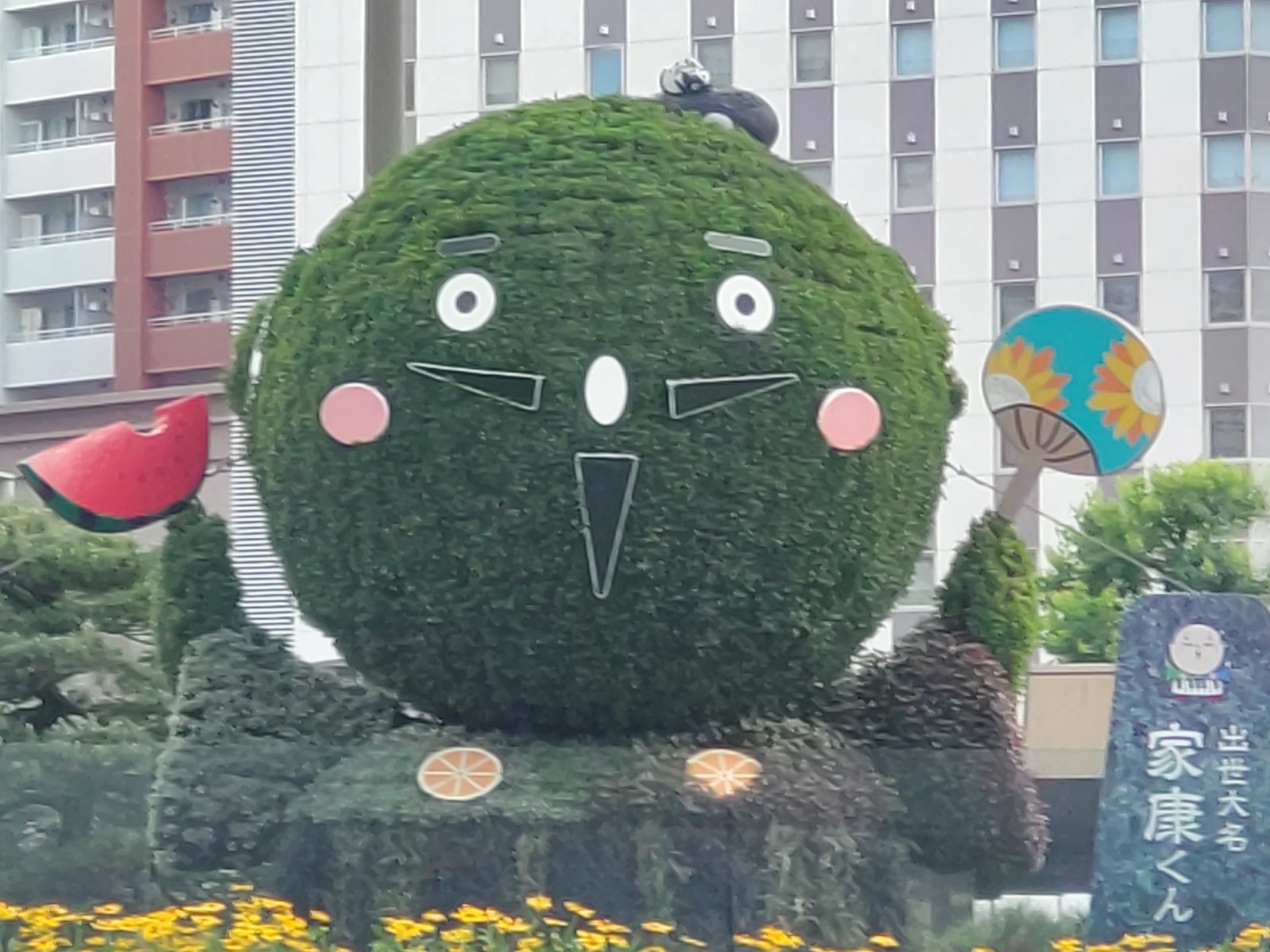 浜松駅北口を出ると浜松市のマスコットキャラクター、「出世大名家康くん」のモザイカルチャーがお出迎え。季節に合わせて装飾が変わり市民の憩いの場となっています。