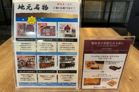 私どもリッチモンドホテル浜松では、早朝でのチェックアウト、朝食ご利用されなかった場合など、ご朝食券をリッチモンドホテルのオリジナルケーキ・または浜松のお土産品と交換できるサービスがございます。