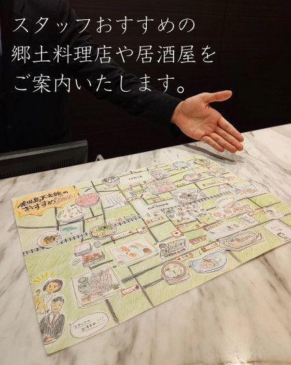 こちらのマップにはスタッフおすすめの郷土料理店や居酒屋、ラーメン店などホテル周辺の飲食店をまとめさせていただいております!
