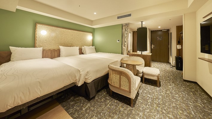 緑を基調とし、ラタン素材など自然を感じる癒しの客室