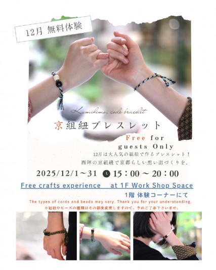 12月は京都の伝統的な「西陣の組紐」で作る、オリジナルの『京組紐ブレスレット』を開催します。