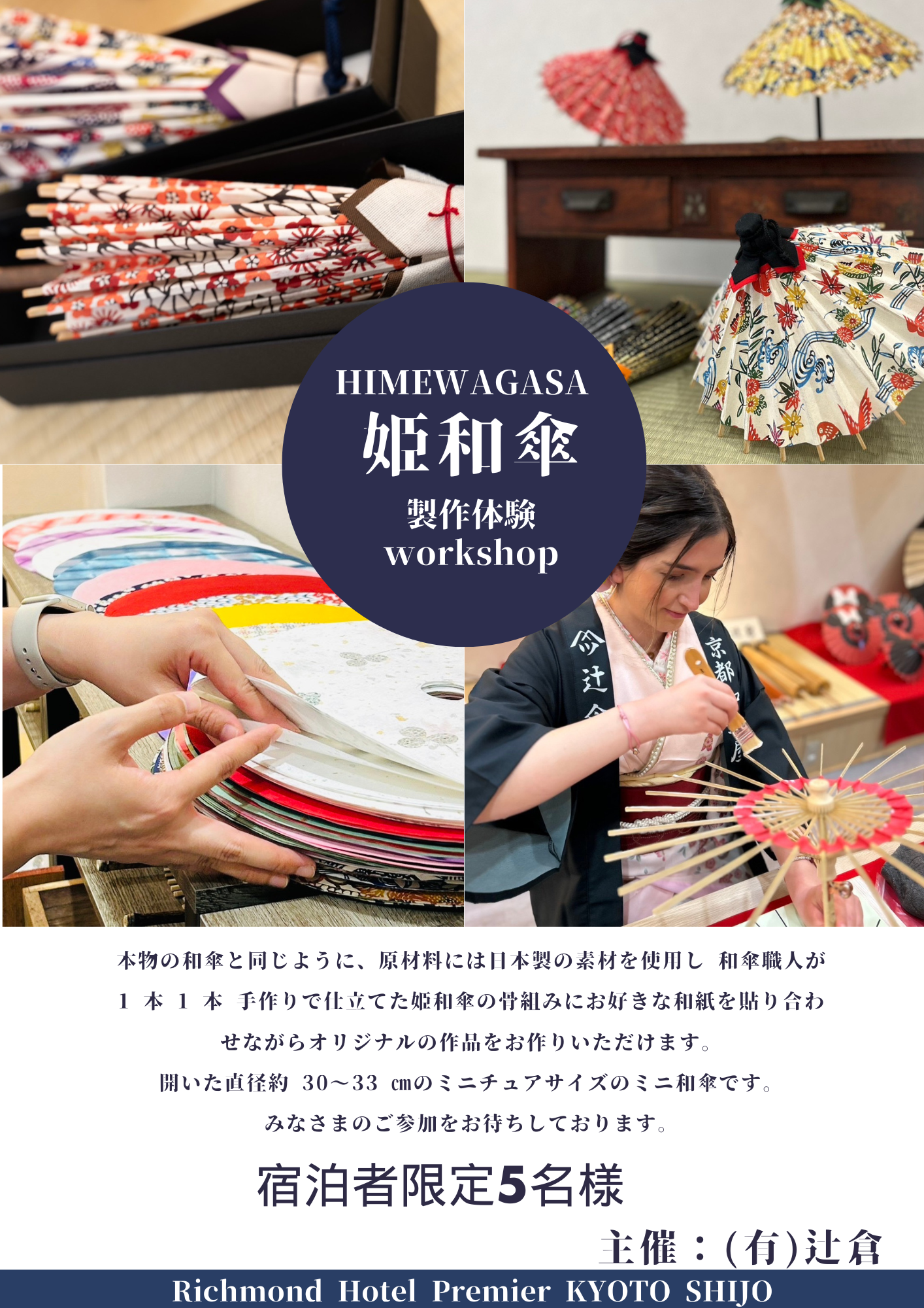 1200年続く日本最古の京和傘屋「辻倉」様にお越しいただき、和傘職人が製作しているものと同じすべて日本製の材料を使って、和傘を小さくした「姫和傘」をお作りいただきます。(開いた直径約 30~33 ㎝のミニチュアサイズ)