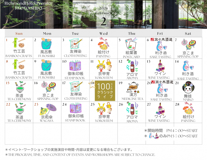 ご宿泊のお客さまは無料で参加いただけますので、ご宿泊日、お名前、ご予約番号をご記載の上、メール(richmondhotel-kyotoshijo@royal.co.jp)または、お電話(075-585-5730)にてホテルまでご連絡をお願い致します。