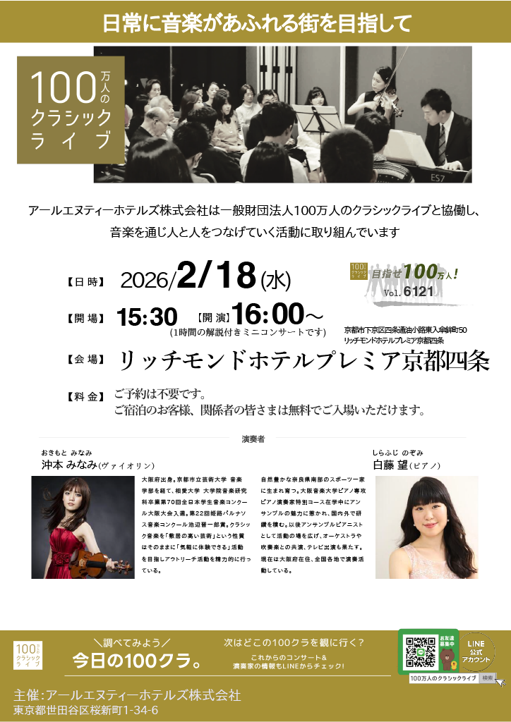 アールエヌティーホテルズは、一般財団法人100万人のクラシックライブとともに、