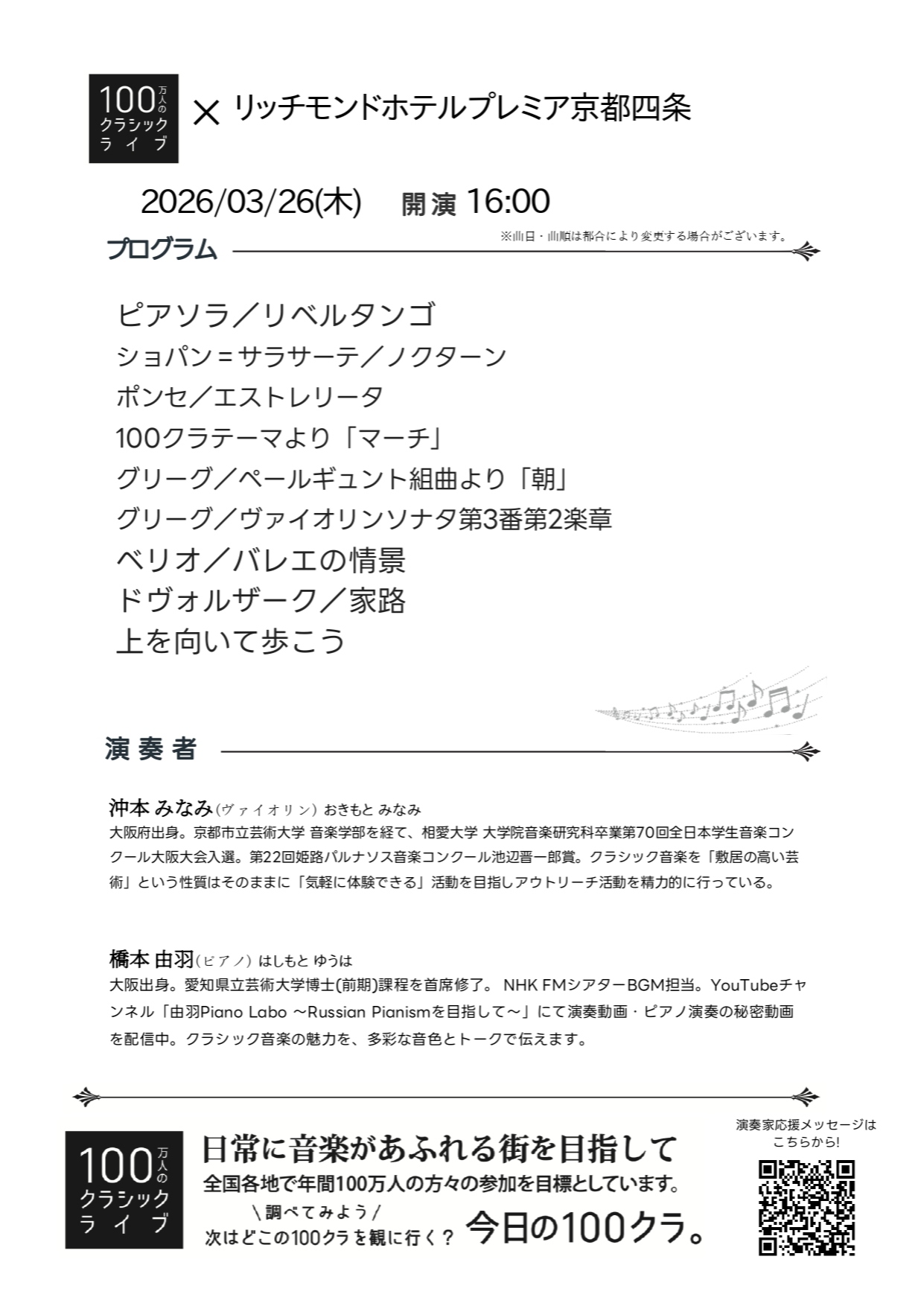 プロの演奏家による本格的なクラシック音楽を間近に楽しめる「 100万人のクラシックライブ」を、リッチモンドホテルプレミア京都四条で開催いたします。