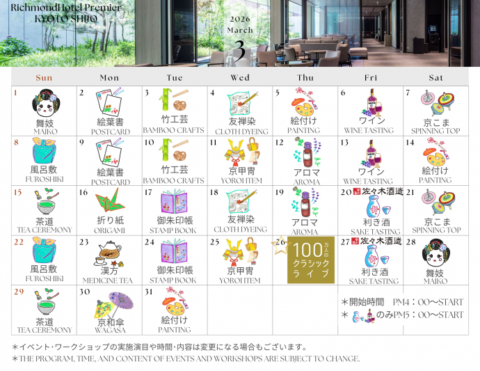 私どものホテルでは、「ホテルで愉しむ京都体験」と題した、館内での体験イベント・ワークショップを日替わりで開催しております。