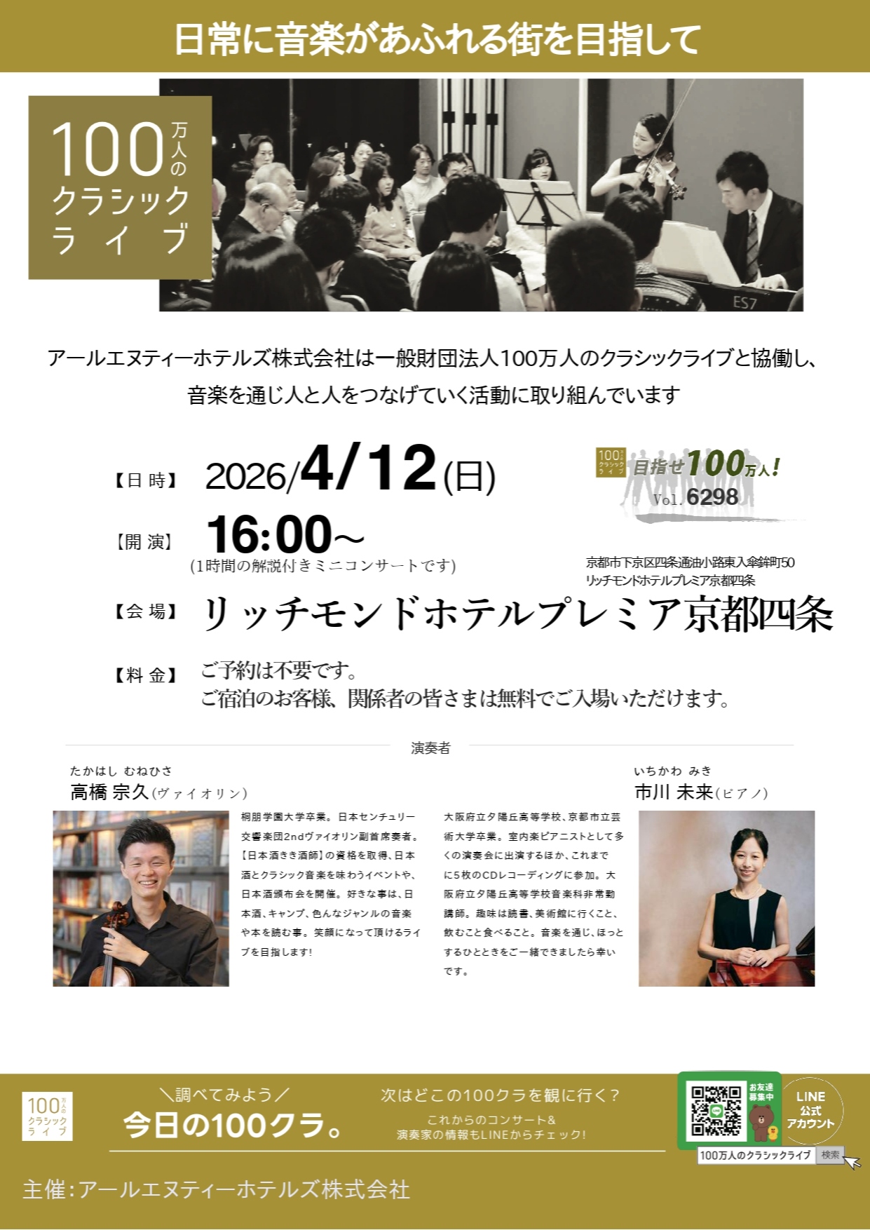 プロの演奏家による本格的なクラシック音楽を間近に楽しめる「 100万人のクラシックライブ」を、リッチモンドホテルプレミア京都四条で開催いたします。