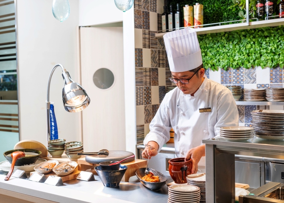 チキン南蛮や冷や汁など、宮崎の郷土料理をはじめとした和洋フルビュッフェスタイルのご朝食をライブキッチンにてご提供いたします。