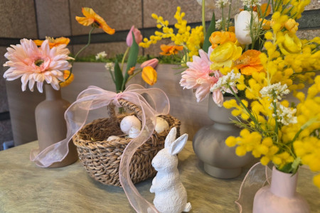 中央には、イースターにちなんだ小さな籠と卵、そして白いうさぎの小物を添えました。