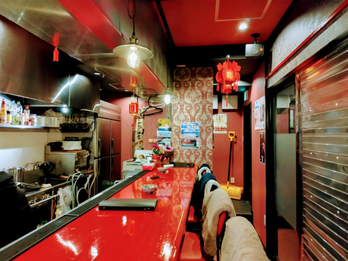 明るい照明に赤を基調としたお店は、アメリカの中華料理店の雰囲気、外から店主さんがフライパンを振る姿やお客様が憩う様子が見