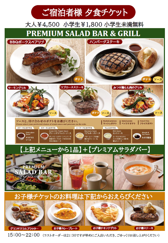 当ホテルでは、ご宿泊者様限定の「夕食チケット」をご用意しております 。