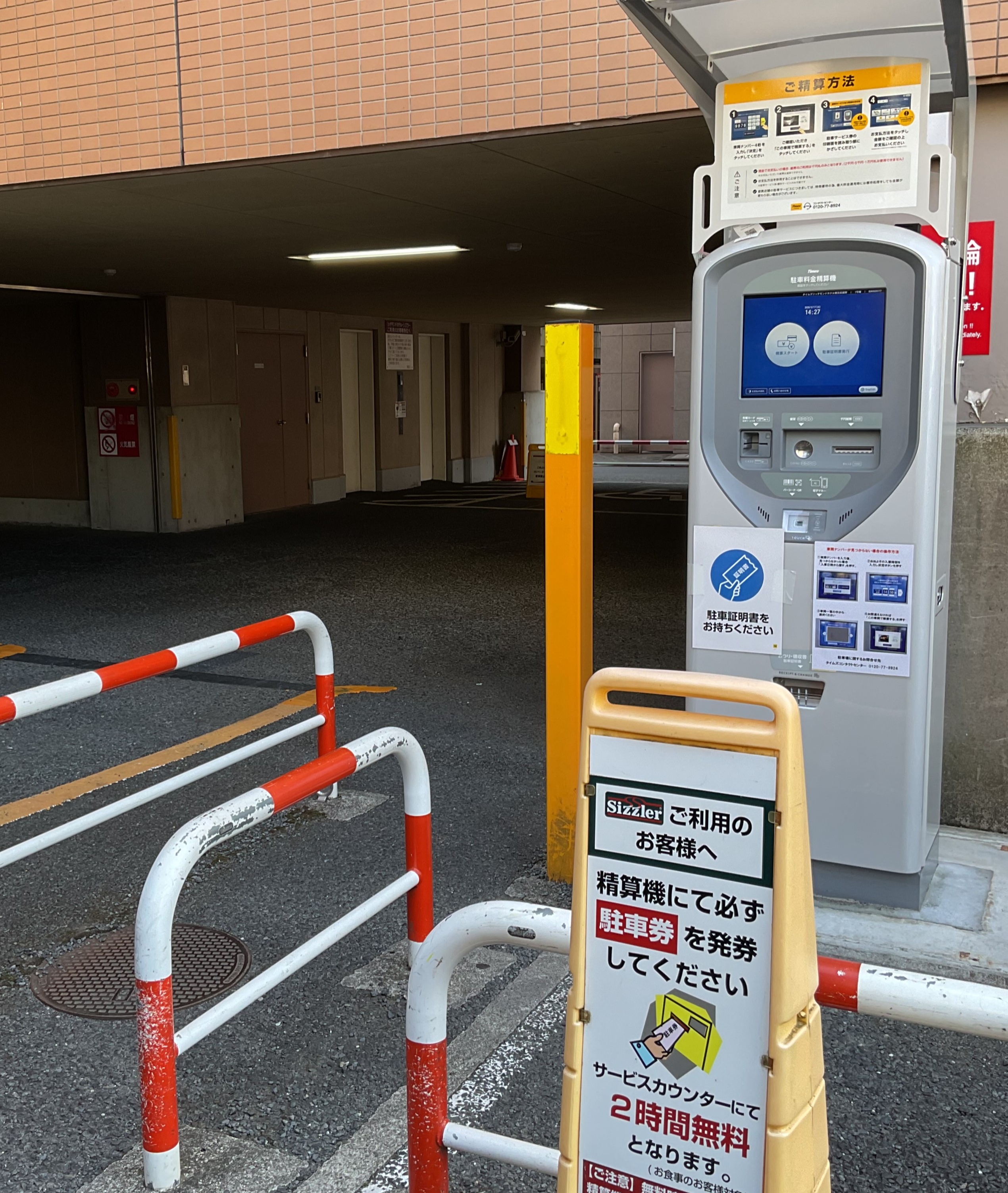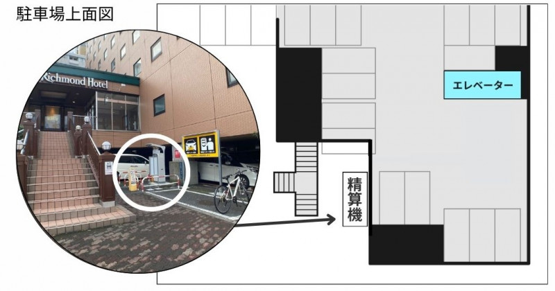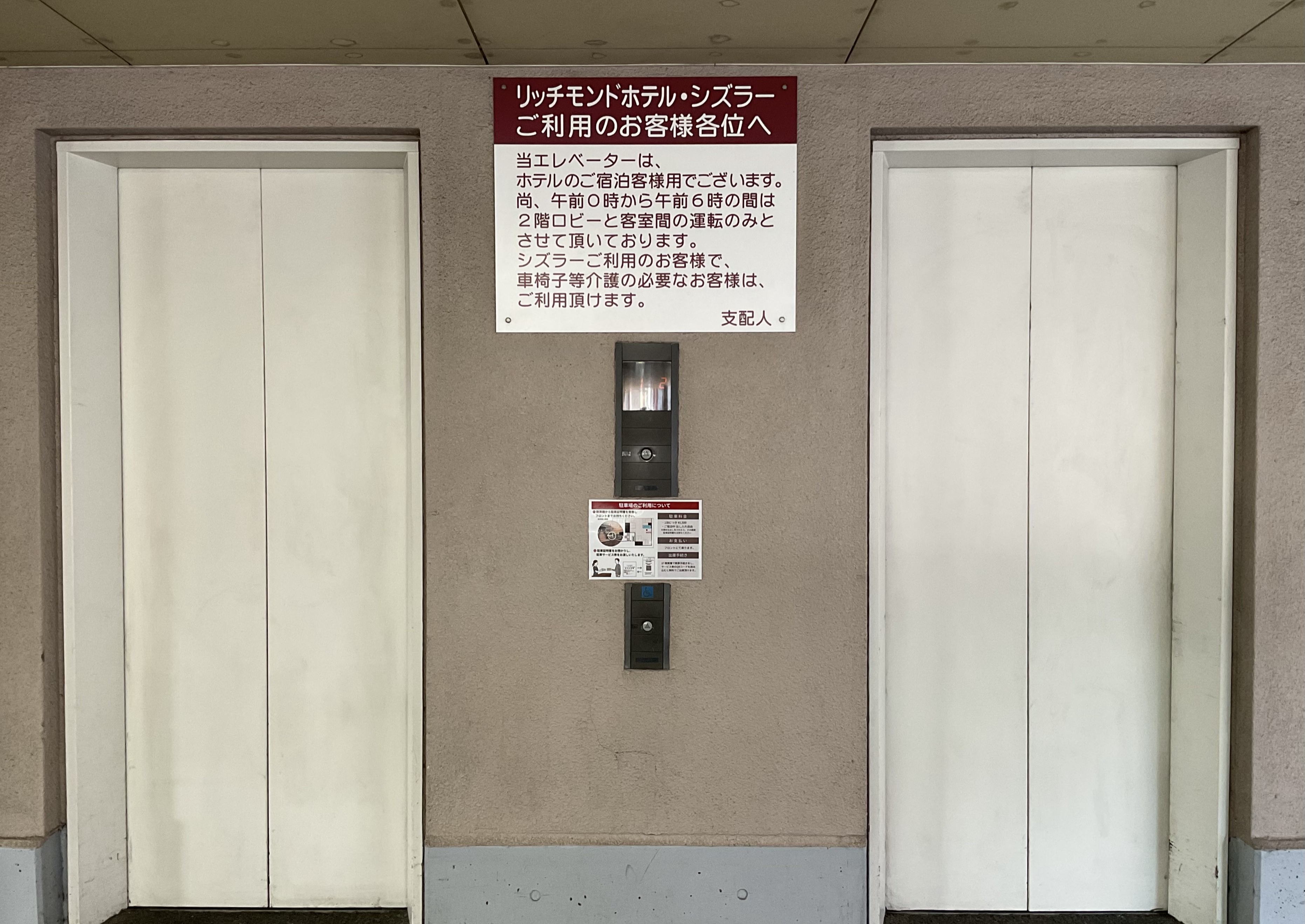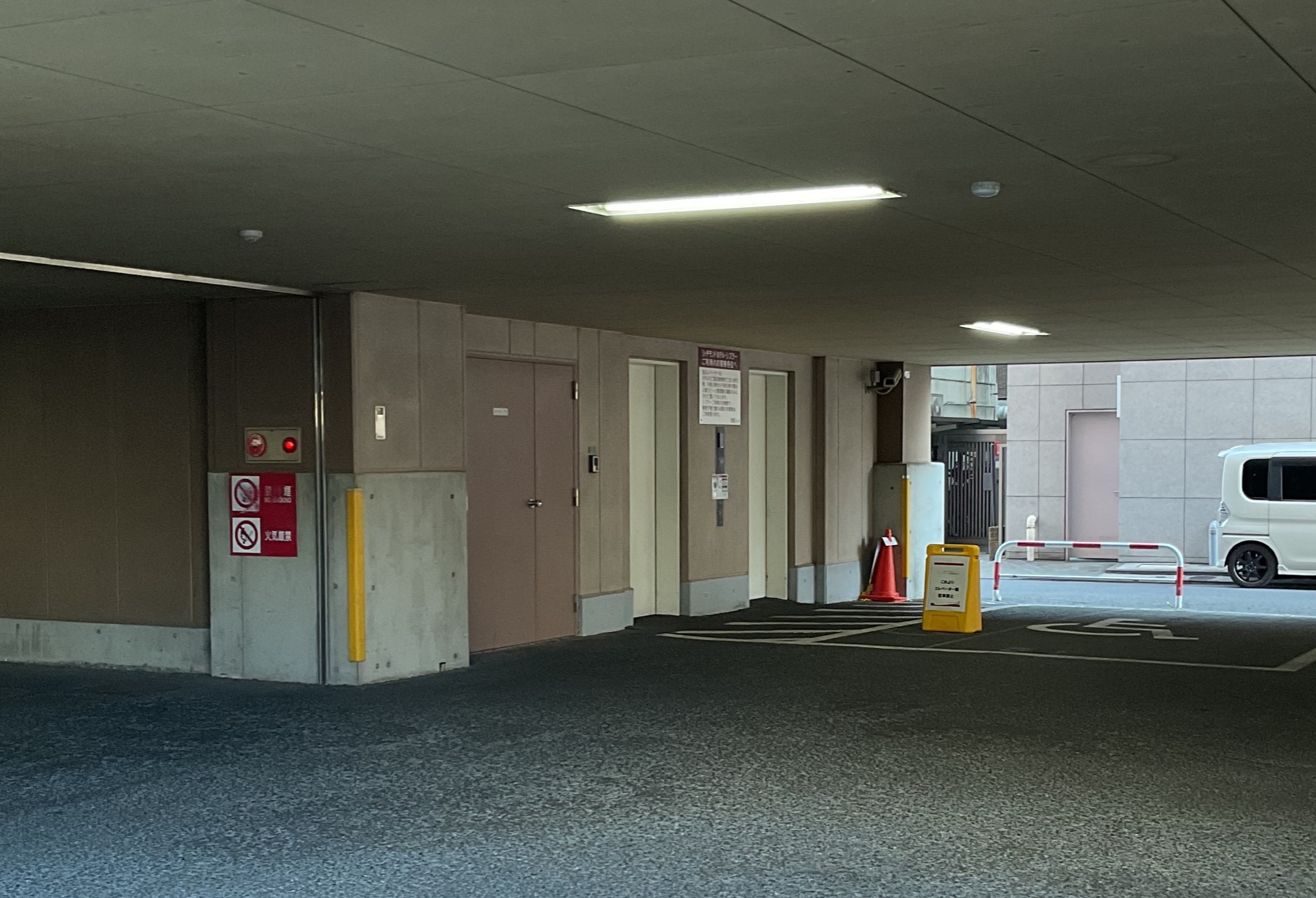 その際は階段右手に白い駐車発券機がございますので、そちらを通り越した先にエレベーターが2台併設しております。