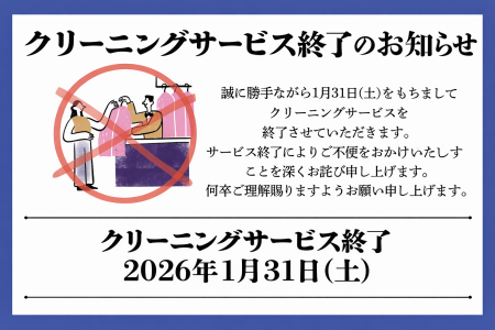このたび誠に勝手ながら、2026年1月31日(土)をもちまして、衣類のクリーニングサービスを終了させていただくこととなりました。