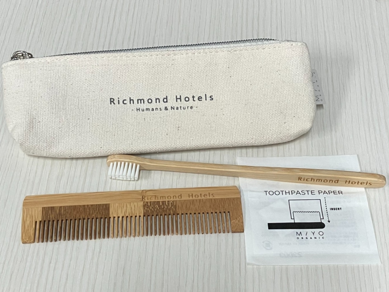 歯磨きペーパー、竹製のくし(リッチモンドホテルズロゴ入り)、竹製の歯ブラシ(リッチモンドホテルズロゴ入り)、横長ポーチ(リッチモンドホテルズロゴ入り)
