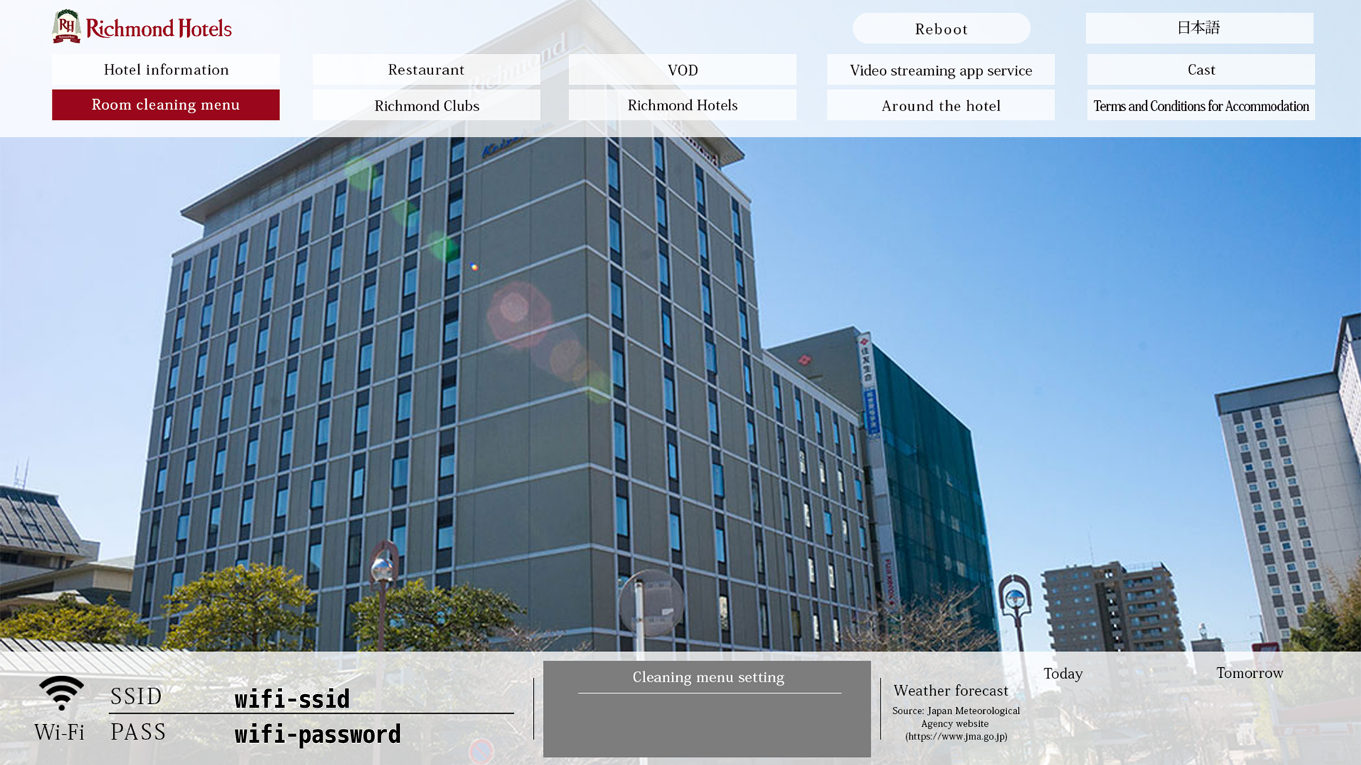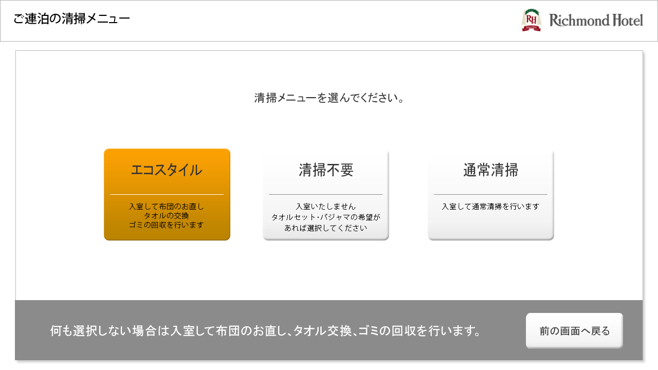 その他、ご希望の清掃方法がございましたら、客室テレビ画面からご選択が必要でございます。