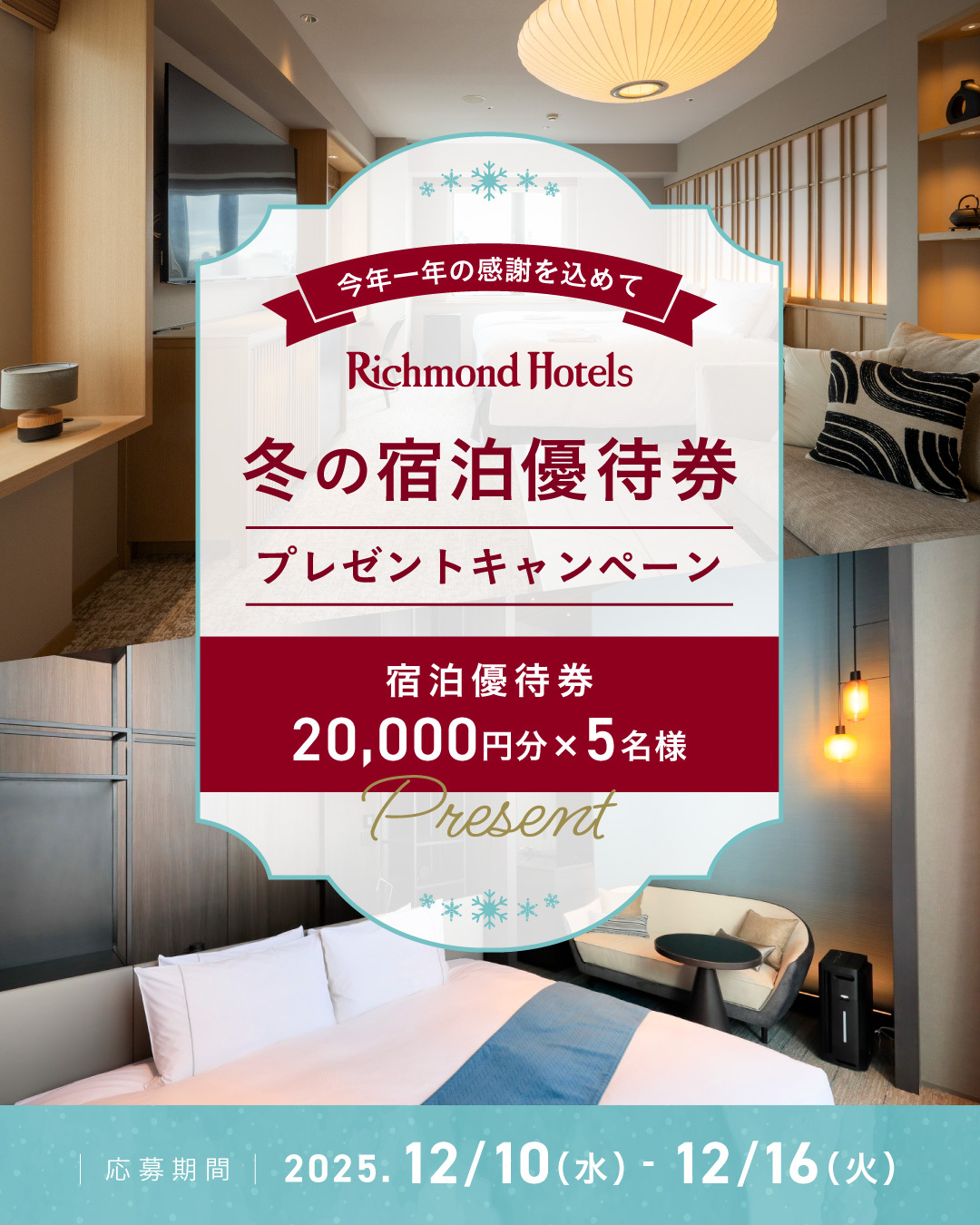 全国のリッチモンドホテルでご利用いただける宿泊優待券20,000円分を抽選で5名様にプレゼント!