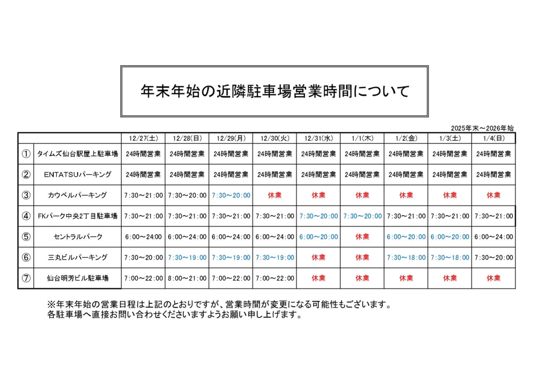 また年末年始は駐車場の営業時間が通常と異なっております。
