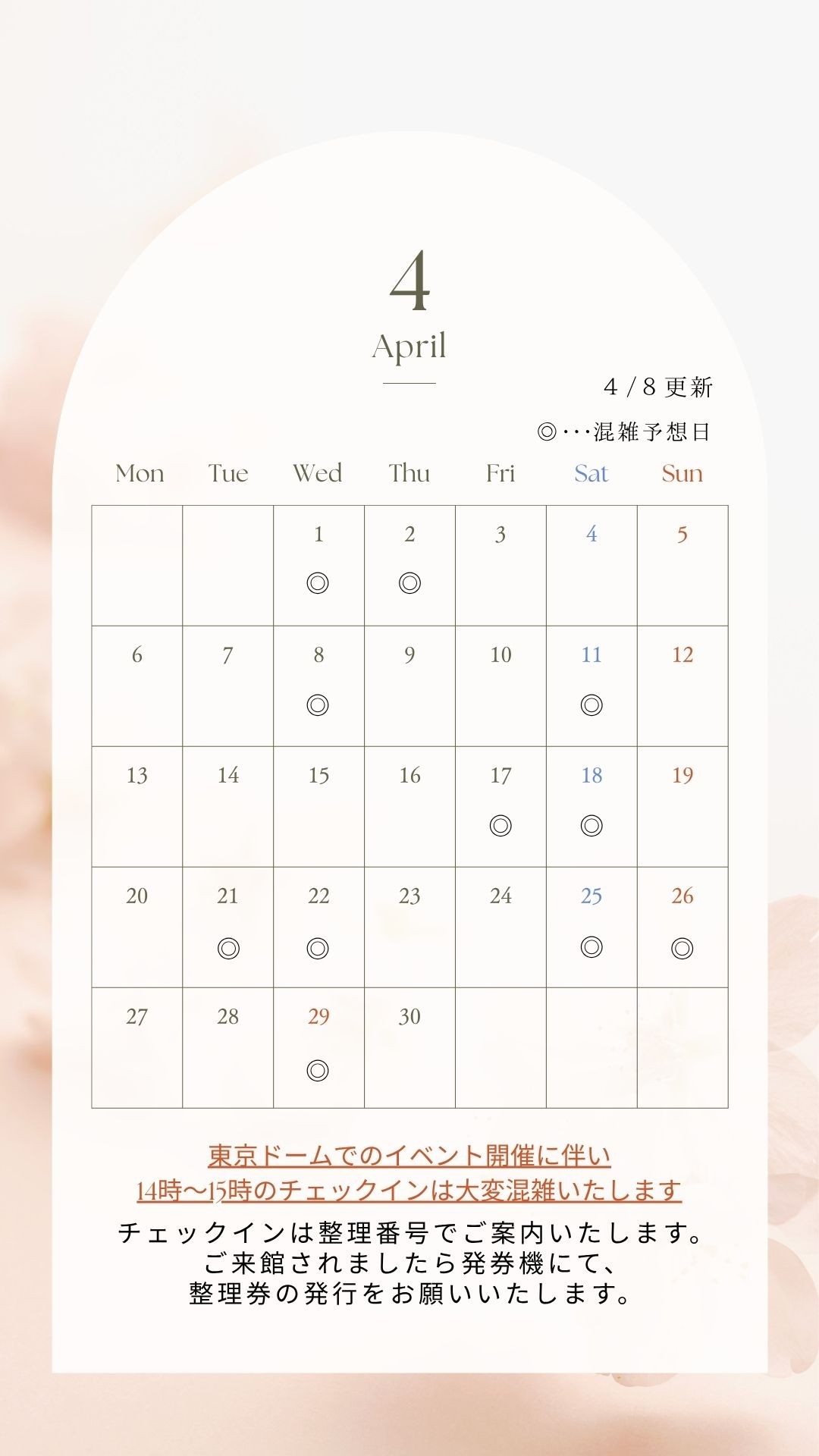 4月の混雑日をお知らせいたします。