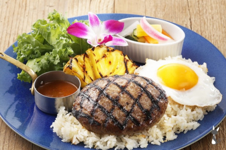 ガーリックライスにハンバーグとフライエッグを添えたハワイの定番料理です。
