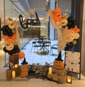 かぼちゃの置物やランタン、たくさんの風船で飾り付けを行いました。