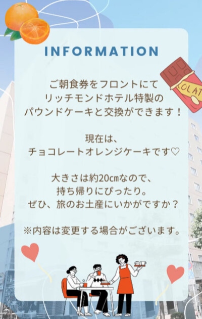 リッチモンドホテルではなんと、朝食券との交換でオリジナルケーキをプレゼントしております。