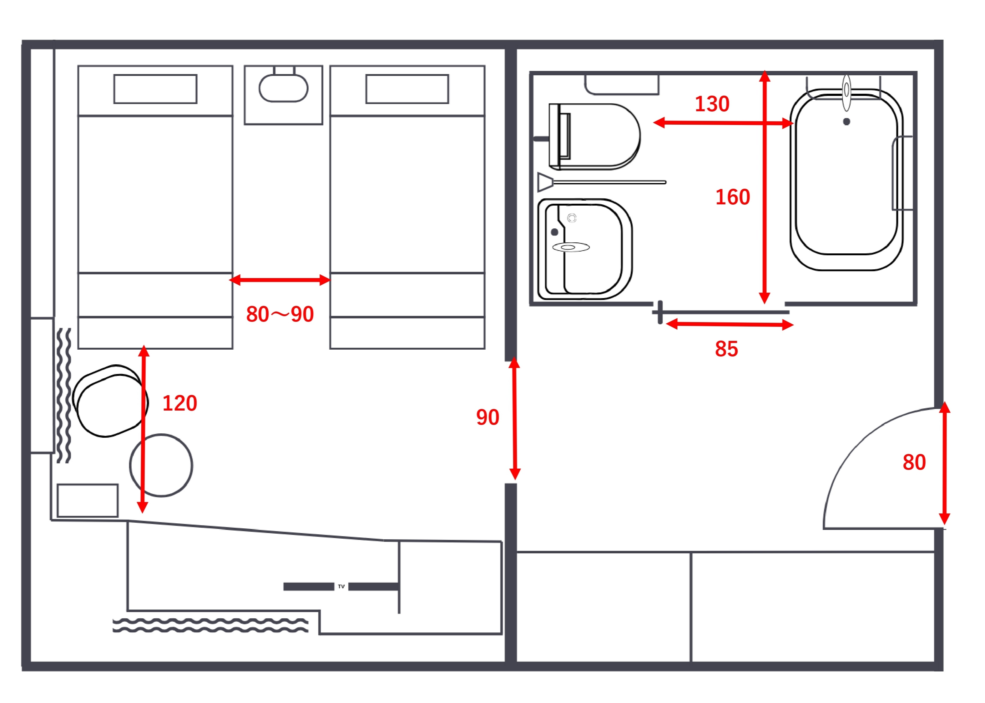 個別空調設備(冷暖房 客室にて切替自由) / 客室内照度240LUX / 携帯充電器 / 有線LAN対応 / 浴室 / 曇り止め鏡 / 卓上鏡(折り畳み) / 毎日洗いたてスリッパ