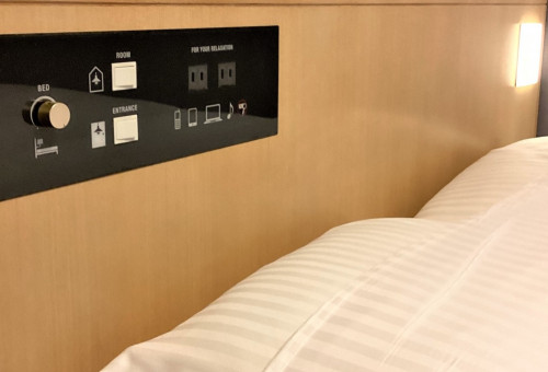 ベッドのヘッドボードには室内照明のスイッチやコンセントがついており、