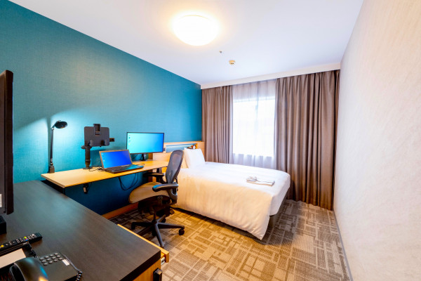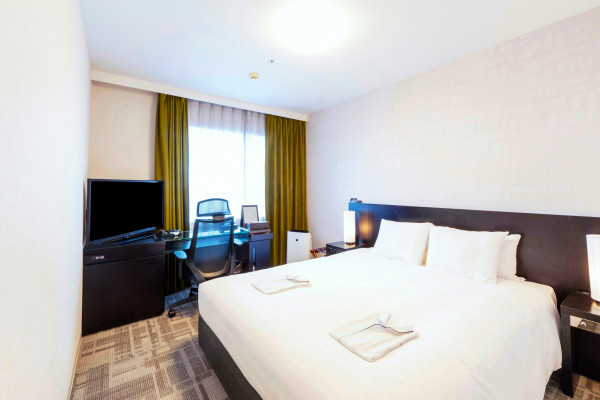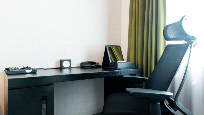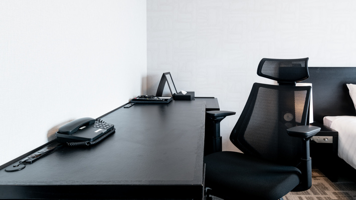 お一人利用が多いビジネスマンのお客様でも広々とご利用いただけるよう、シングルルームでも140cmの幅広ベッドを採用。また、客室から出ずともワーキングスペースとして活用できるよう大型デスクもご用意。