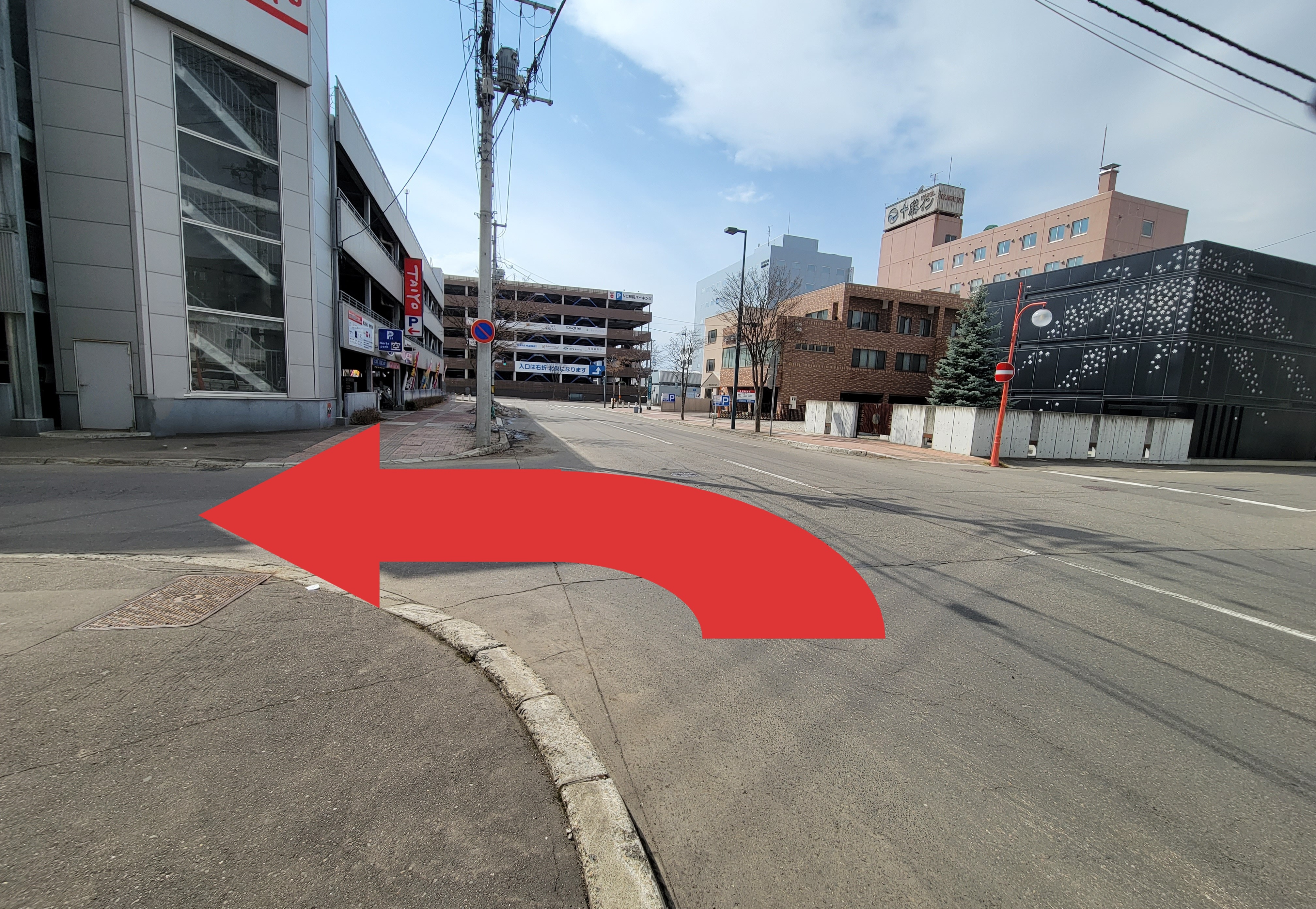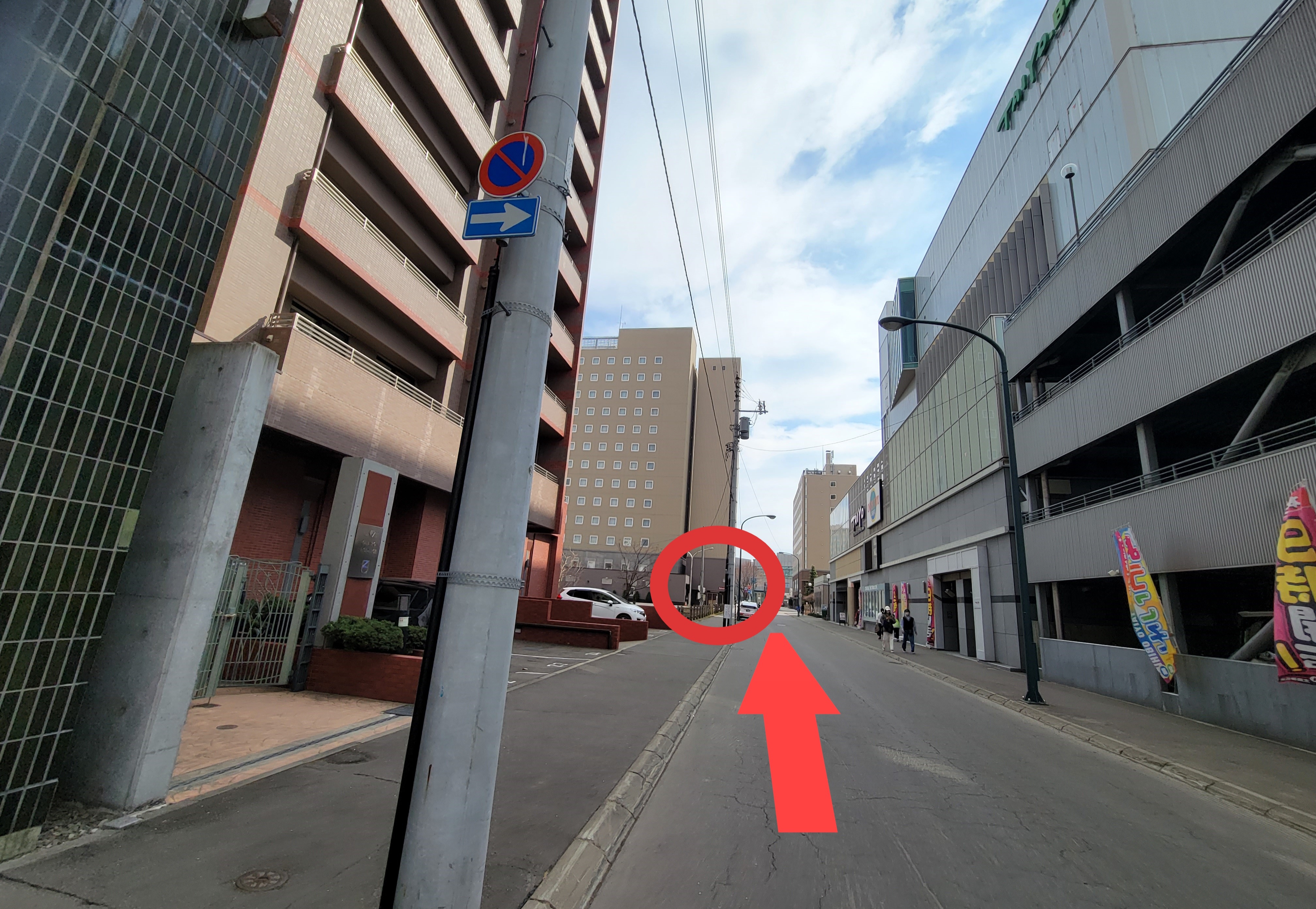 太陽ビル立体駐車場手前にある信号のない交差点を左折して一方通行道路へ入る